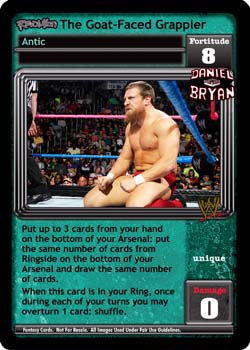 Put up to 3 cards from your hand on the bottom of your Arsenal: put the same number of cards from Ringside on the bottom of your Arsenal and draw the same number of cards. When this card is in your Ring, once during your turn you may overturn 1 card: shuffle.