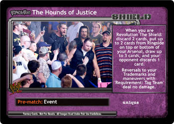 When you are Revolution The Shield: discard 2 cards, put up to 2 cards from Ringside on top or bottom of your Arsenal, draw up to 3 cards, and your opponent discards 1 card. Reversals to your Trademarks and maneuvers with 'Requirement: Tag Team' deal no damage.
