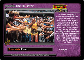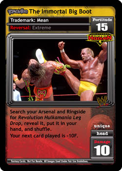 Search your Arsenal and Ringside for Revolution Hulkamania Leg Drop, reveal it, put it in your hand, and shuffle. Your next card played is -10F.