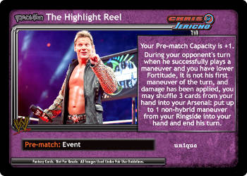 Your Pre-match Capacity is +1. During your opponent's turn when he successfully plays a maneuver and you have lower Fortitude, it is not his first maneuver of the turn, and damage has been applied, you may shuffle 3 cards from your hand into your Arsenal: put up to 1 non-hybrid maneuver from your Ringside into your hand and end his turn.