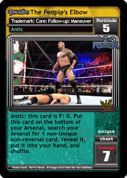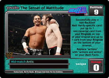 Can only be packed by Revolution Matt Hardy. Successfully play a non-Backlash Matt Hardy-specific card: put up to 1 non-reversal card from your Ringside on top of your Arsenal and up to 1 card from your Ringside on the bottom of your Arsenal. Replace the 'actions' text with 'actions and antics' on your Matt Facts.