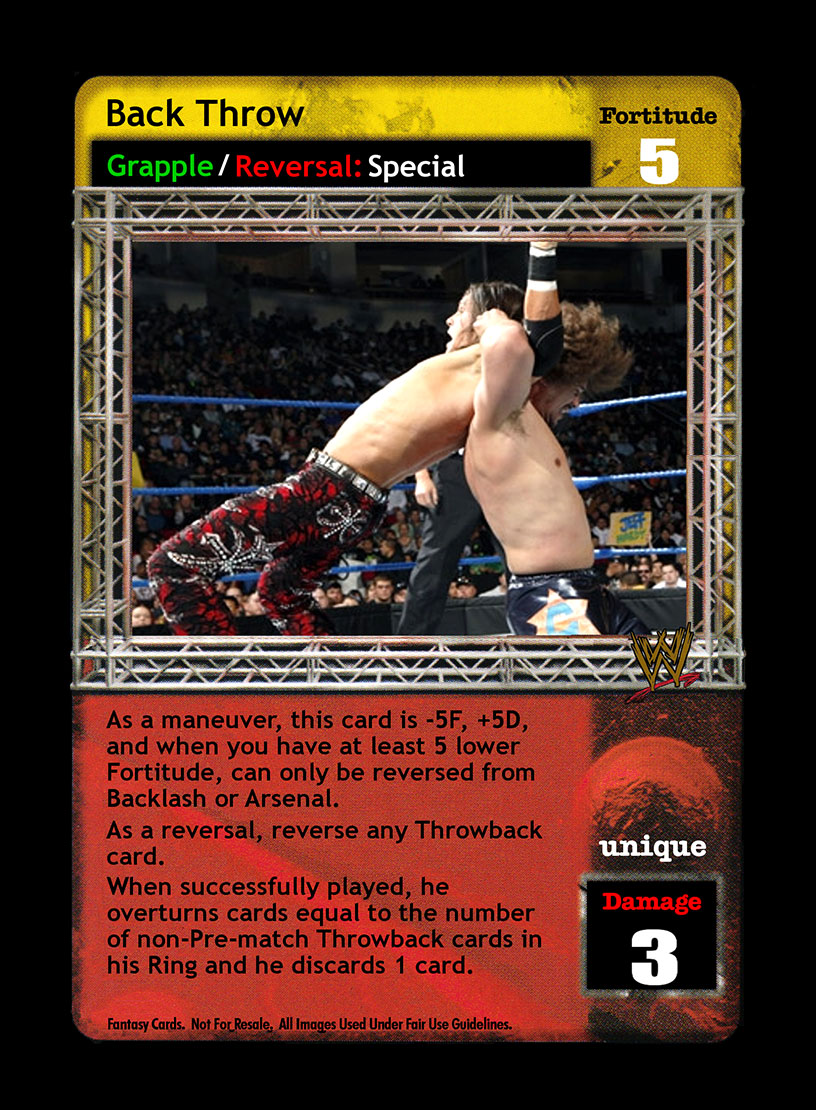 As a maneuver, this card is -5F, +5D, and when you have at least 5 lower Fortitude, can only be reversed from Backlash or Arsenal. As a reversal, reverse any Throwback card. When successfully played, he overturns cards equal to the number of non-Pre-match Throwback cards in his Ring and he discards 1 card.