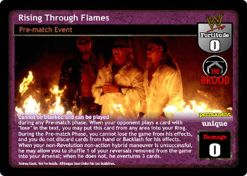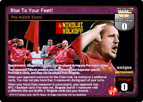 Requirement: Allegiance: Faction. Can be played during any Pre-match phase. Your opponent cannot prevent you from playing your Superstar-specific Pre-match cards, and they can be played from Ringside. When your opponent overturns for the Chain trait, he overturns 2 additional cards. You may not play more than 2 maneuvers during each of your turns. When your Hand Chain maneuver is unsuccessful, your opponent may RFG 1 Backlash card; if he does not, Ringside Search 1 maneuver with a different title and shuffle 2- Ringside cards into your Arsenal.