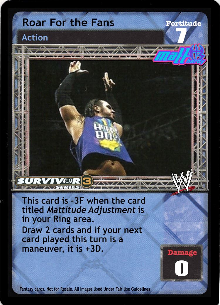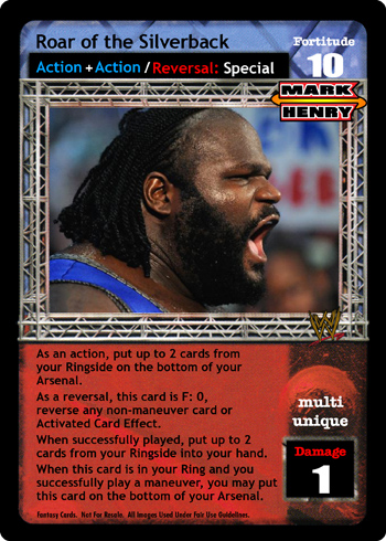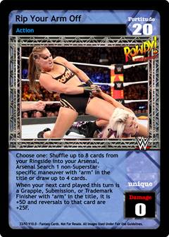 Choose one: Shuffle up to 8 cards from your Ringside into your Arsenal, Arsenal Search 1 non-Superstar-specific maneuver with ‘arm’ in the title or draw up to 4 cards. When your next card played this turn is a Grapple, Submission, or Trademark Finisher with ‘arm’ in the title, it is +5D and reversals to that card are +25F.