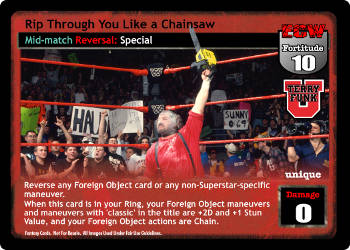 Reverse any Foreign Object card or any non-Superstar-specific maneuver. When this card is in your Ring, your Foreign Object maneuvers and maneuvers with 'classic' in the title are +2D and +1 Stun Value, and your Foreign Object actions are Chain.