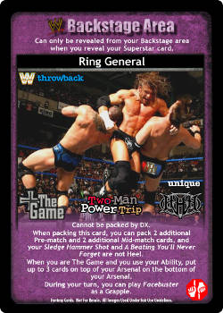 Cannot be packed by DX. When packing this card, you can pack 2 additional Pre-match cards and 2 additional Mid-match cards, and your Sledge Hammer Shot and A Beating You'll Never Forget cards are not Heel. When you are The Game and you use your Ability, put up to 3 cards on top of your Arsenal on the bottom of your Arsenal. During your turn, you may play Facebuster as a Grapple.