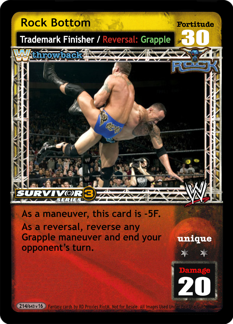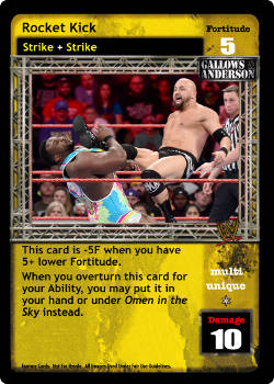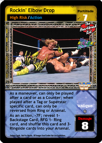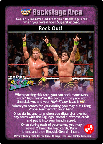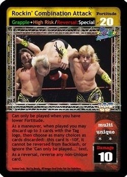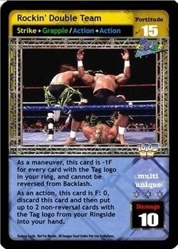 As a maneuver, can only be played after a successfully played Superstar-specific maneuver or card with the Tag logo. Can only be reversed from Ring or Arsenal, but can be reversed as if it were non-unique. As an action, this card is -7F, shuffle this card into your Arsenal and choose one: reveal 1 hidden Backstage Card (ignore the 'Can only be revealed...' text) or remove 1 card in your Ring from the game and then shuffle up to 3 cards from your Ringside into your Arsenal.