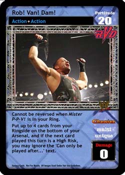 Cannot be reversed when Mister P-P-V! is in your Ring. Put up to 4 cards from your Ringside on the bottom of your Arsenal, and if the next card played is a High Risk, you may ignore the 'Can only be played after...' text.