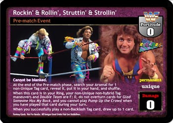 Cannot be blanked. At the end of the Pre-match phase, search your Arsenal for 1 non-Unique Tag card, reveal it, put it in your hand, and shuffle. When this card is in your Ring, your non-Unique non-hybrid Tag maneuvers and Double Team are F: 0, do not overturn cards for Glad Someone Has My Back, and you cannot play Pump Up the Crowd when you have played that card during your turn. When you successfully play a non-Backlash Tag card, draw up to 1 card.