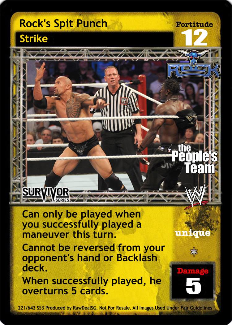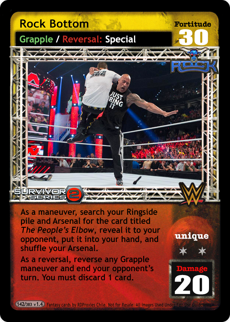 As a maneuver, search your Ringside pile and Arsenal for the card titled The People's Elbow, reveal it to your opponent, put it into your hand, and shuffle your Arsenal. As a reversal, reverse any Grapple maneuver and end your opponent's turn. You must discard 1 card.