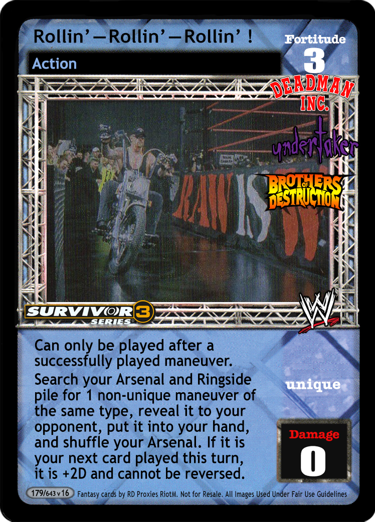 Can only be played after a successfully played maneuver. Search your Arsenal or Ringside pile for a non-unique card of the same type of maneuver successfully played, show it to your opponent, place it in your hand, then shuffle your Arsenal. If that maneuver is the next card you play, it is +2D and cannot be reversed.