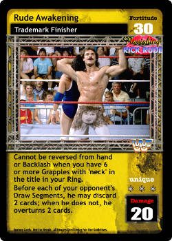 Cannot be reversed from hand or Backlash when you have 6 or more Grapples with 'neck' in the title in your Ring. Before each of your opponent's Draw Segments, he may discard 2 cards; when he does not, he overturns 2 cards.