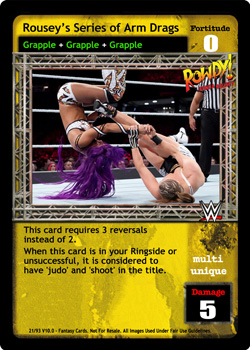 This card requires 3 reversals instead of 2. When this card is in your Ringside or unsuccessful, it is considered to have 'judo' and 'shoot' in the title.