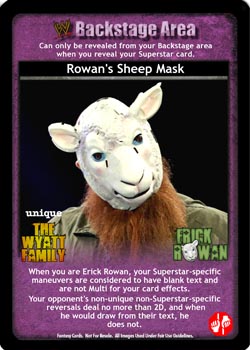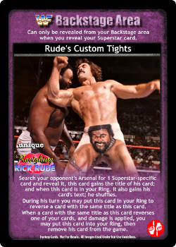 Search your opponent's Arsenal for 1 Superstar-specific card and reveal it, this card gains the title of his card; and when this card is in your Ring, it also gains his card's text; he shuffles. During his turn you may put this card in your Ring to reverse a card with the same title as this card. When a card with the same title as this card reverses one of your cards, and damage is applied, you may put this card in to your Ring, then remove his card from the game.