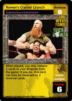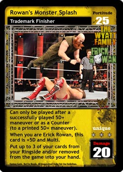 Can only be played after a 5D+ maneuver or as a Counter (to a printed 5D+ maneuver). When you are Erick Rowan, this card is +5D and Multi. Put up to 3 of your cards from your Ringside and/or removed from the game into your hand.