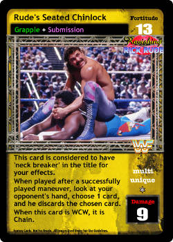 This card is considered to have 'neck breaker' in the title for your effects. When played after a successfully played maneuver, look at your opponent's hand, choose one card, and he discards the chosen card. When this card is WCW, it is also Chain.