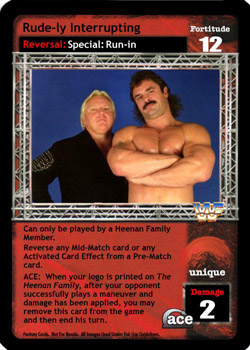 Can only be played by a Heenan Family Member. Reverse any Mid-match card or any Activated Card Effect from a Pre-match card. ACE: When your logo is printed on The Heenan Family, after your opponent successfully plays a maneuver and damage has been applied, you may remove this card from the game and then end his turn.