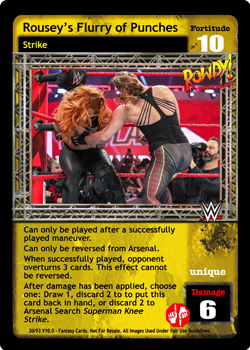 Can only be played after a successfully played maneuver. Can only be reversed from Arsenal. When successfully played, opponent overturns 3 cards. This effect cannot be reversed. After damage has been applied, choose one: Draw 1, discard 2 to put this card back in hand, or discard 2 to Arsenal Search Superman Knee Strike.