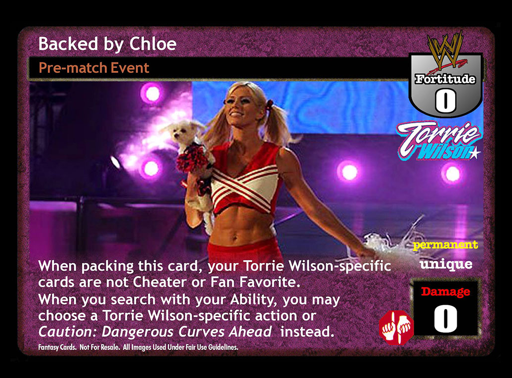 When packing this card, your Torrie Wilson-specific cards are not Cheater or Fan Favorite. When you search with your Ability, you may choose a Torrie Wilson-specific Action or Caution: Dangerous Curves Ahead instead.
