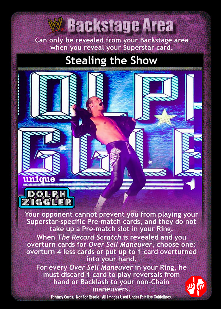 Your opponent cannot prevent you from playing your Superstar-specific Pre-match cards, and they do not take up a Pre-match slot in your Ring. When The Record Scratch is revealed and you overturn cards for Over Sell Maneuver, choose one: overturn 4 less cards or put up to 1 card overturned into your hand. For every Over Sell Maneuver in your Ring, he must discard 1 card to play reversals from hand or Backlash to your non-Chain maneuvers.