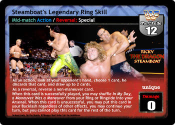 As an action, look at your opponent's hand, choose 1 card, he discards that card, and draw up to 2 cards. As a reversal, reverse a non-maneuver card. When this card is successfully played, you may shuffle In My Day, a Maneuver Was a Maneuver from your Ring or Ringside into your Arsenal. When this card is unsuccessful, you may put this card in your Backlash regardless of other effects, you may continue your turn, but you cannot play this card for the rest of the turn.
