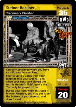 Can only be played when you have an nWo card in your Ring. Shuffle up to 3 cards from your Ringside into your Arsenal, and when your next card played this turn is Maintain Hold, ignore the 'Can only be played...' text. During your turn when this card is in your Ringside, you may put it on the bottom of your Arsenal, and draw 1 card.