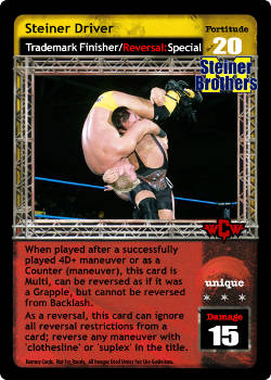 When played after a successfully played 4D+ maneuver or as a Counter (maneuver), this card is Multi, can be reversed as if it was a Grapple, but cannot be reversed from Backlash. As a reversal, this card can ignore all reversal restrictions from a card; reverse any maneuver with 'clothesline' or 'suplex' in the title.
