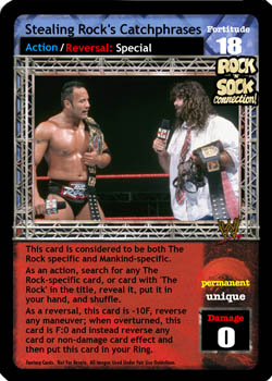 This card is considered to be both The Rock-specific and Mankind-specific. As an action, search for any The Rock-specific card, or card with 'The Rock' in the title; reveal it, put it in your hand, and shuffle. As a reversal, this card is -4F, reverse any maneuver; when overturned, this card is F:0 and instead reverse any card or non-damage card effect, and then put this card in your Ring.