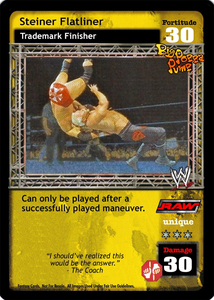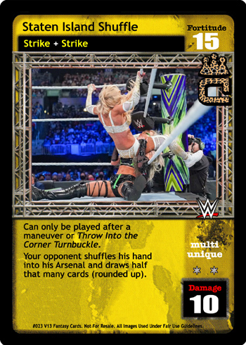 Can only be played after a maneuver or Throw Into the Corner Turnbuckle. Your opponent shuffles his hand into his Arsenal and draws half that many cards (rounded up).