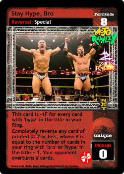 This card is -1F for every card with 'hype' in the title in your Ring. Completely reverse any card of printed D: # or less, where # is equal to the number of cards in your ring with 'bro' or 'hype' in the title + 1. Your opponent overturns # cards.