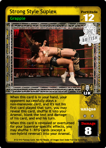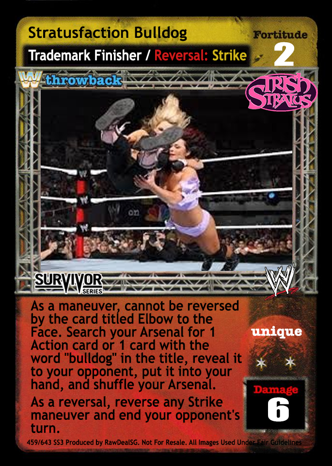 As a maneuver, cannot be reversed by the card titled Elbow to the Face. Search your Arsenal for 1 Action card or 1 card with the word "bulldog" in the title, reveal it to your opponent, put it into your hand, and shuffle your Arsenal. As a reversal, reverse any Strike maneuver and end your opponent's turn.