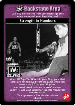 When All Together Now is in your Ring, your Heat cards are not removed from the game when you move a card from your Ringside. Your Multi nWo Run-in cards are Chain and Volley: 4, and your Superstar-specific maneuvers are nWo cards. Your opponent's The Numbers Game is blank.