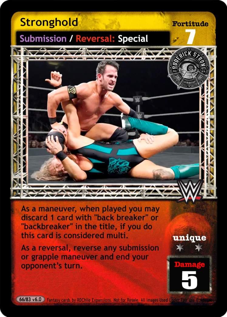 As a maneuver, when played you may discard 1 card with “back breaker” or “backbreaker” in the title, if you do this card is considered multi. As a reversal, reverse any submission or grapple maneuver and end your opponent`s turn.