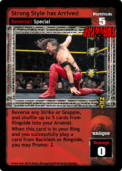 Reverse any Strike or Grapple, and shuffle up to 5 cards from Ringside into your Arsenal. When this card is in your Ring and you successfully play a card from Backlash or Ringside, you may Promo: 2.