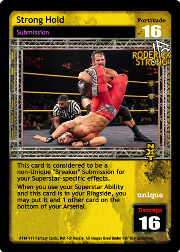 This card is considered to be a non-Unique 'Breaker' Submission for your Superstar-specific effects. When you use your Superstar Ability and this card is in your Ringside, you may put it and 1 other card on the bottom of your Arsenal.