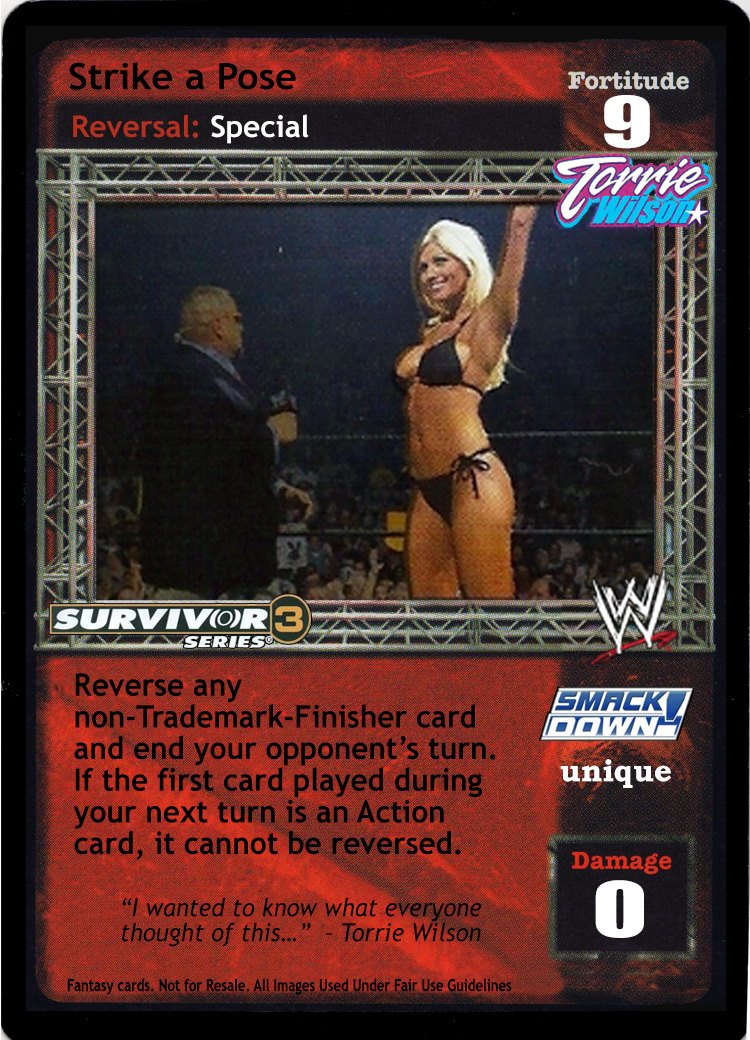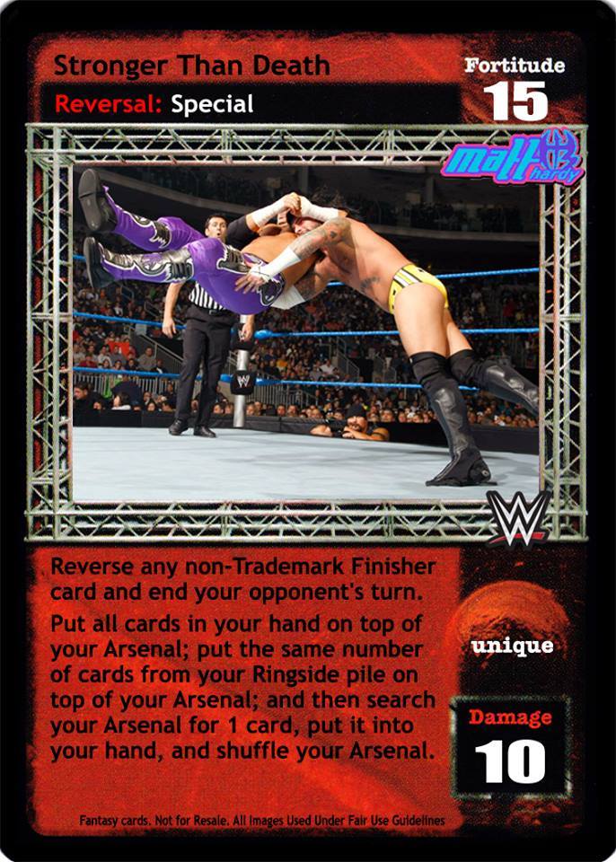 Reverse any non-Trademark Finisher card and end your opponent's turn. Put all cards in your hand on top of your Arsenal; put the same number of cards from your Ringside pile on top of your Arsenal; and then search your Arsenal for 1 card, put it into your hand, and shuffle your Arsenal.