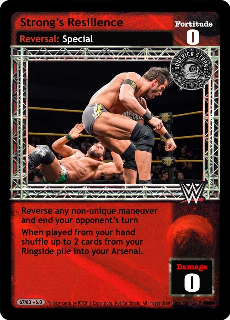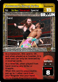 As a maneuver, this card is -5F, and when played as a Counter, it is Multi and can only be reversed by 2 reversal cards. As a reversal, when played from hand reverse any Strike or Grapple. When this card is unsuccessful, put up to 1 other card from your Ringside into your hand.