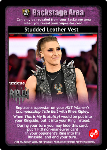 Replace a superstar on your NXT Women's Championship Title Belt with Rhea Ripley. When This Is My Brutality! would be put into your Ringside, put it into your Ring instead. During your turn you may hide this card, put 1 F:0 non-maneuver card in your opponent's Ring into his Ringside, and end your turn.