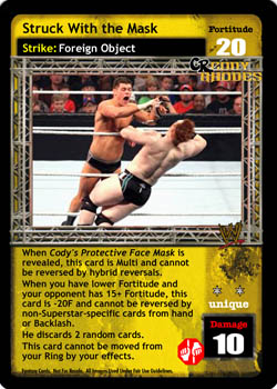 When Cody's Protective Face Mask is revealed, this card is Multi and cannot be reversed by hybrid reversals. When you have lower Fortitude and your opponent has 15 or greater Fortitude, this card is -20F and cannot be reversed by non-Superstar-specific cards from hand or Backlash. He discards 2 random cards. This card cannot be moved from your Ring by your effects.