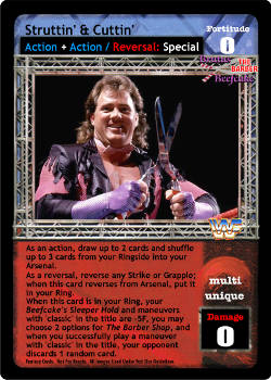 As an action, draw up to 2 cards and shuffle up to 3 cards from your Ringside into your Arsenal. As a reversal, reverse any non-Unique Strike or Grapple; when this card reverses from Arsenal, put it in your Ring. When this card is in your Ring, your Beefcake's Sleeper Hold and maneuvers with 'classic' in the title are -5F, you may choose 2 options for The Barber Shop, and when you successfully play a maneuver with 'classic' in the title, your opponent discards 1 random card.
