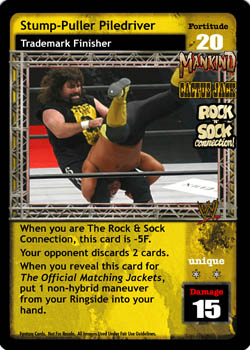 When you are The Rock and Sock Connection, this card is -5F. Your opponent discards 2 cards. When you reveal this card for The Official Matching Jackets, put 1 non-hybrid maneuver from your Ringside into your hand.