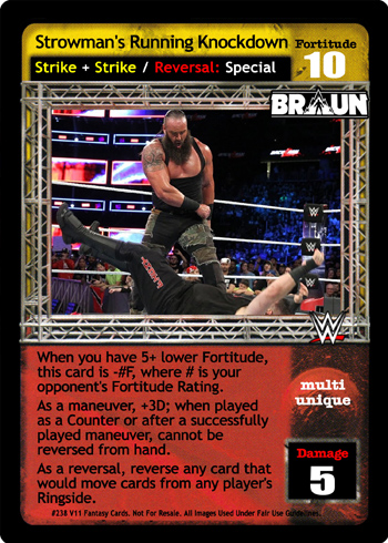 When you have 5+ lower Fortitude, this card is -#F, where # is your opponent's Fortitude Rating. As a maneuver, +3D; when played as a Counter or after a successfully played maneuver, cannot be reversed from hand. As a reversal, reverse any card that would move cards from any player's Ringside.