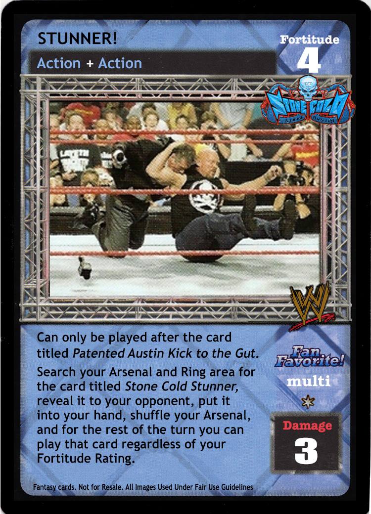 Can only be played after the card titled Patented Austin Kick to the Gut. Search your Arsenal and Ring area for the card titled Stone Cold Stunner, reveal it to your opponent, put it into your hand, shuffle your Arsenal, and for the rest of the turn you can play that card regardless of your Fortitude Rating.