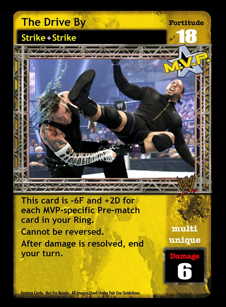 This card is -6F and +2D for each MVP-specific Pre-match in your Ring. Cannot be reversed. After damage is resolved, end your turn.