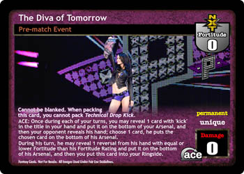 Cannot be blanked. When packing this card, you cannot pack Technical Drop Kick. ACE: Once during each of your turns, you may reveal 1 card with 'kick' in the title in your hand and put it on the bottom of your Arsenal, and then your opponent reveals his hand; choose 1 card, he puts the chosen card on the bottom of his Arsenal. During his turn, he may reveal 1 reversal from his hand with equal or lower Fortitude than his Fortitude Rating and put it on the bottom of his Arsenal, and the you put this card into your Ringside.