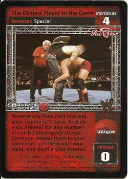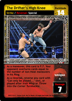 As a maneuver, this card is F:7. Your opponent overturns cards equal to the number of non-Heat maneuvers in his Ring. As a reversal, reverse any card with ‘Can only be played...’ text, or played after Irish Whip or Throw Into the Corner Turnbuckle.