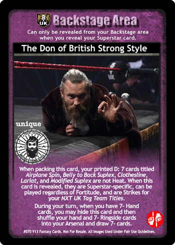 When packing this card, your printed D: 7 cards titled Airplane Spin, Belly to Back Suplex, Clothesline, Lariat, and Modified Suplex are not Heat. When this card is revealed, they are Superstar-specific, can be played regardless of Fortitude, and are Strikes for your NXT UK Tag Team Titles. During your turn, when you have 7- Hand cards, you may hide this card and then shuffle your hand and 7- Ringside cards into your Arsenal and draw 7- cards.