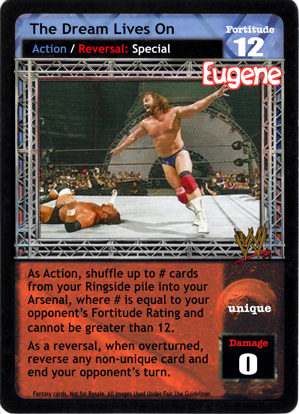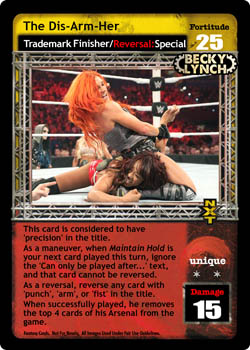 As an action, shuffle up to # cards from your Ringside pile into your Arsenal, where # is equal to your opponent's Fortitude Rating and cannot be greater than 12. As a reversal, when overturned, reverse any non-unique card and end your opponent's turn.