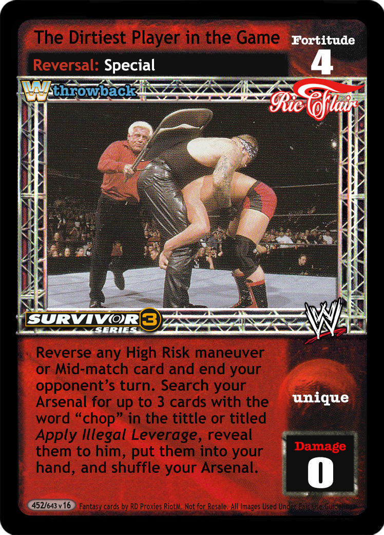 Reverse any High Risk maneuver or Mid-match card and end your opponent's turn. Search your Arsenal for up to 3 cards with the word "chop" in the title or titled Apply Illegal Leverage, reveal them to him, put them into your hand, and shuffle your Arsenal.