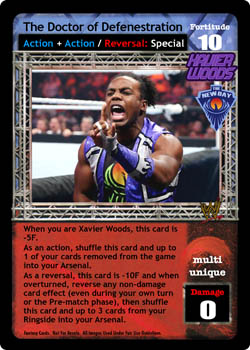 When you are Xavier Woods, this card is -5F. As an action, shuffle this card and up to 1 of your cards removed from the game into your Arsenal. As a reversal, this card is -10F and when overturned, reverse any non-damage card effect (even during your own turn or the Pre-match phase), then shuffle this card and up to 3 cards from your Ringside into your Arsenal.